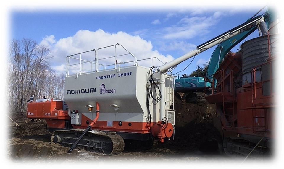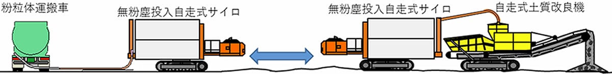 そこから自走式土質改良機までは無粉塵投入自走式サイロに積替えて運搬を行います。
