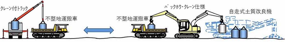 自走式土質改良工は原料土を現地改良する場合に用いられ、プラントが建設できない狭隘地や長距離移動が必要な条件でも現地施工が可能です。その際、固化材として使用するフレコンはタイヤ式運搬車で搬入されますが、自走式土質改良機までの搬入走路が走行できない場合には、その区間について不整地運搬車による積替え運搬を行う必要があります。土質改良時には、土質改良機付属クレーンでフレコンを貯留装置上まで吊上げて、袋底を開き改良材を落下投入します。